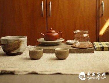 當(dāng)然也可以利用桌巾或桌面的處理來加強(qiáng)茶具的視覺效果,如桌子與茶具都是深色或都是淺色,就可以利用桌巾的顏色將茶具突顯出來,如茶席是利用捆綁花枝的粗草席作為桌巾鋪在桌面,再置上粗放的手拉坯茶具。一幅隨興、不修邊幅的畫面。
