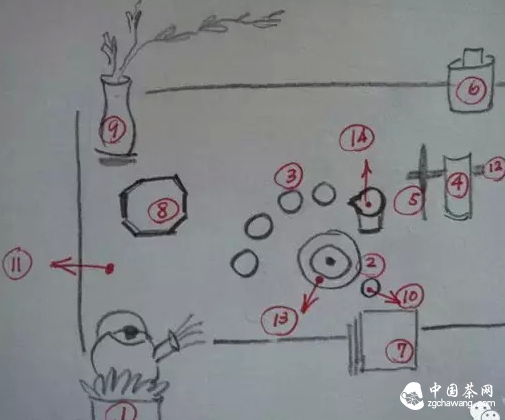 (我太久沒教/使用基礎(chǔ)席,畫完圖編完號,一看,怎么才12個(gè)物件,明明該有13個(gè)?心想大概是壺承吧,所以就加畫一圈,湊13。但覺得以前教,好像沒把壺承當(dāng)那么重要。打字時(shí)明白是少了勻杯,哈,可是沒時(shí)間重畫,那就從此14唄。壺承其實(shí)應(yīng)給予重視,泡茶器有了它,價(jià)值感提升,讓整個(gè)席的主客關(guān)系更清楚,因而茶席更穩(wěn)定)。
