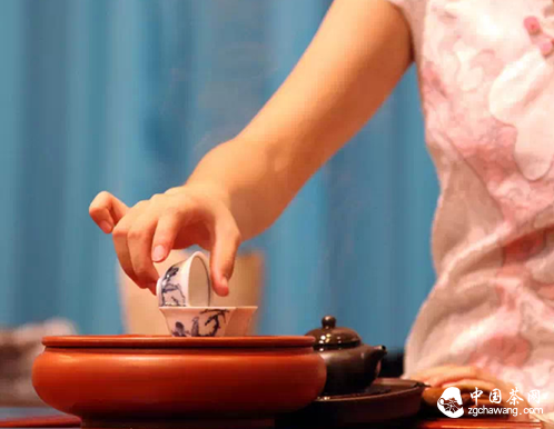 捧杯敬茶是茶藝小姐用雙手把龍鳳杯捧到齊眉高,然后恭恭敬敬地向右側(cè)的第一位客人行注目點(diǎn)頭禮后把茶傳給他??腿私拥讲韬蟛荒塥?dú)自先品為快,應(yīng)當(dāng)也恭恭敬敬地向茶藝小姐點(diǎn)頭致謝,并按照茶藝小姐的姿勢(shì)依次將茶傳給下一位客人,直到傳到坐在離茶藝小姐最遠(yuǎn)的一位客人為止。然后再?gòu)淖髠?cè)同樣依次傳茶。通過(guò)捧杯敬茶眾手傳盅,可使在座的賓主們心貼得更緊,感情更親近,氣氛更融洽。
