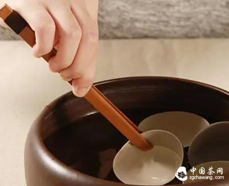 一種是直接往擺好的茶杯中沖水,另一種是用茶夾將茶杯夾到水盂上方,進(jìn)行潔具。