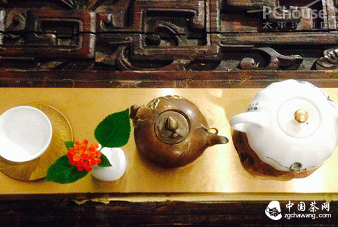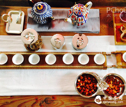 在潔白的桌旗的烘托下,高貴的茶具成為一種藝術(shù)品。原木色的茶桌畫著歲月的年輪,訴說(shuō)著茶的歷史。精美的茶壺對(duì)稱擺放,時(shí)尚的雕花銀質(zhì)容器又表達(dá)著充滿現(xiàn)代元素的藝術(shù)。