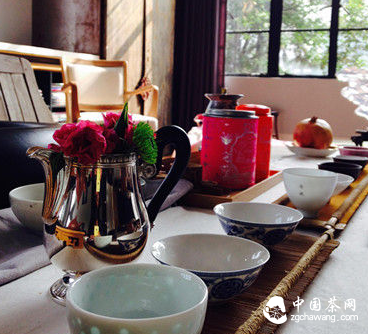 古樸幽雅的傳統(tǒng)茶器,古典摩登的銀器,在茶桌上進(jìn)行著文化的碰撞。紅色茶罐與鮮紅的花朵,成為桌上一抹紅,宛如一個(gè)熱情活力的姑娘。