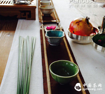 從整個(gè)茶桌望去,竹制茶托讓“茶客”視線不斷延伸,各種茶碗仿佛一條項(xiàng)鏈上的彩石,有序連串。鮮綠青嫩的長(zhǎng)葉緊緊依偎在銀扣里,替代了餐巾。銀色器皿映照著熟的發(fā)紅的石榴,像一朵綻放的花朵。