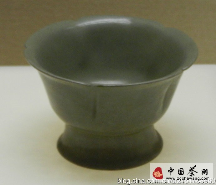 五瓣葵口內(nèi)凹底秘色瓷盤碗:卷沿,尖唇,斜鼓腹,底內(nèi) 平處內(nèi)凹,通體施釉,青綠泛灰。通高6.8厘米,深6.2厘米,口 徑24.5厘米,底徑4.5厘米,重902克。此盤碗也是點茶器。