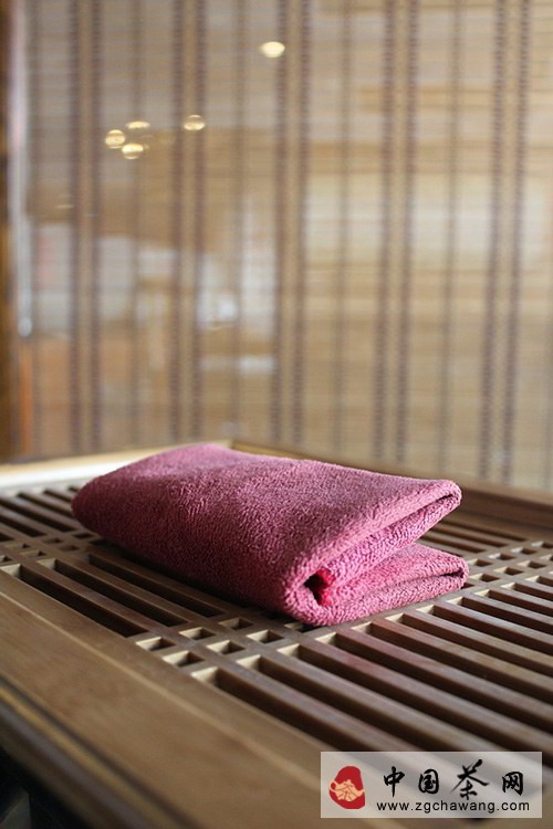 茶巾:茶巾又稱為“茶布”,多用麻、棉等纖維制造,茶巾的主要功用是干壺,在酌茶之前將茶壺或茶海底部銜留的雜水擦干,也可擦拭滴落桌面之茶水。在沖泡茶水時(shí)講究壺起壺落沾茶巾。