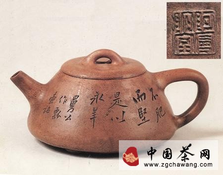 紫砂陶刻藝術(shù):是一門綜合藝術(shù)性很強的“壺上金石文化”。紫砂陶刻,據(jù)記載:元末明初的紫砂傳器就有銘刻,但只是記載,無從考證。從明蔡司霑《薺園叢話》里記載道:“余于白下獲一紫砂罐(當(dāng)時俗稱壺為罐)有‘且吃茶、清隱’草書五字,知為孫高士之遺物,每以泡茶古雅絕倫”。(孫高士即孫道明、號清隱元末人,曾以其居名為“且吃茶處”,形成紫砂刻書之先河。到明萬歷年間,紫砂器的壺底刻款日漸風(fēng)行。明時大彬制六角壺,壺底鐫“萬歷丙申年時大彬”二行楷書,還有“一林清茗,可沁清脾”大彬刻。至天啟崇禎年間(1621~1644)年更有陳子畦書法晉唐風(fēng)格,沈子澈款制古雅渾樸等。 一種歷史文化現(xiàn)象的形成,必須產(chǎn)生于當(dāng)代歷史文化氛圍下優(yōu)秀的文化土壤之中和騷人墨客的參與。紫砂壺上“金石文化藝術(shù)”的形成,也同樣如此。清嘉慶年間,精于金石書畫的陳鴻壽酷愛紫砂藝術(shù),他也投入並設(shè)計了流芳后世的“曼生十八式”及許多傳世佳作,他充分發(fā)揮了自己博古精文,精深的書法篆刻藝術(shù)崇尚秦漢風(fēng)格。由于這位紫砂藝術(shù)史上第一位父母官,以博大精深的藝術(shù)胸懷積極參與倡導(dǎo)壺上金石文化藝術(shù)“從而使當(dāng)時壺金石文化大為興盛,大受鼓舞,形成了一種歷史上難得的曼生壺文化現(xiàn)象。”