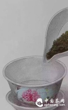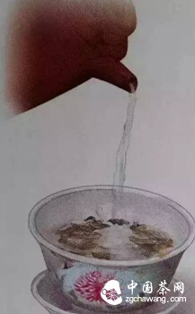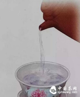以繞圈方式將水注入蓋碗內(nèi),使每片茶葉都得到充分滋潤(rùn)、受熱。
