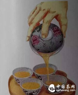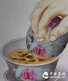 用食指、中指和大拇指拿起蓋碗,食指輕壓杯蓋中間,中指和大拇指齊齊抓住蓋杯口邊緣,將蓋杯提起,使蓋杯稍微向前傾斜,徐徐倒茶于小茶杯內(nèi)。清代亦有不用小茶杯而直接使用蓋碗飲茶的方式。