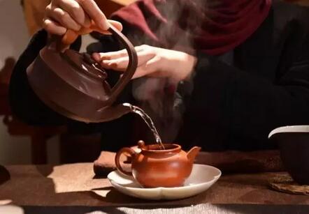 茶葉泡到尾水,出于浸出更多物質(zhì),提升陳香的雙重考慮,我們需要提高浸泡時(shí)的水溫。這時(shí),和初期正好相反,我們不但不開(kāi)蓋降溫散味,還要在出水后立即注水,以保持被浸泡茶葉的高溫。紫砂壺由于其本身導(dǎo)熱性差,保持葉溫的能力天然較強(qiáng)。而蓋碗則降溫極快,于是就有了這樣的動(dòng)作次序:準(zhǔn)備出湯時(shí)開(kāi)始加熱水→水將沸騰時(shí)開(kāi)始出湯→湯出凈后先注水泡茶→泡好茶后再端起公道杯分茶。