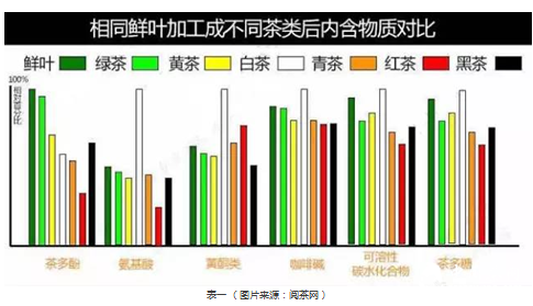 從表一中可以看出,雖然不同茶葉里茶多酚、氨基酸、生物堿、糖類、芳香類物質(zhì)、維生素類、礦物質(zhì)、蛋白質(zhì)等內(nèi)含物組分幾乎一樣,但是白茶在黃酮類、氨基酸、可溶性碳水化合物、多糖等含量超過其他茶類,有效成分含量上可謂獨(dú)樹一幟,這也是白茶比其他茶類更具有保健功效的基礎(chǔ)。