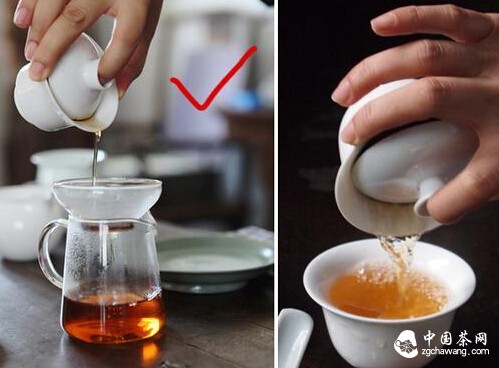 左圖拿蓋碗的手勢(shì)不偏不歪,沿著公道杯慢慢向下讓茶水緩緩流出??梢院苊黠@的看到茶水并沒(méi)有觸到手。右圖拿蓋碗明顯偏了,茶水也就會(huì)沿著斜的位置流水,這樣極容易燙到。而且在倒茶時(shí)被燙,不得不停下來(lái),稍微停下來(lái),沒(méi)倒出來(lái)的茶水又會(huì)重新在蓋碗里浸泡茶葉,這時(shí)口感就會(huì)有所改變。所以正確的拿蓋碗倒茶手勢(shì)就是像左圖這樣,與公道杯要垂直。別緊張。手指不需要太用力抓著蓋碗邊緣,越用勁其實(shí)越緊張,放松點(diǎn)。大家都是被燙過(guò)的過(guò)來(lái)人,燙幾次就習(xí)慣了。