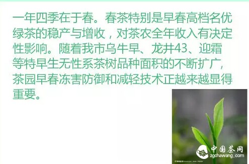 茶園防凍要做好以下工作。一是要經(jīng)常關注氣象預報,及早做好預防工作。二是在冷空氣到來前,對已開采茶園要盡量采下適制芽葉,以免受凍損失。三是在冷空氣來臨前,積極采取以下措施進行預防。