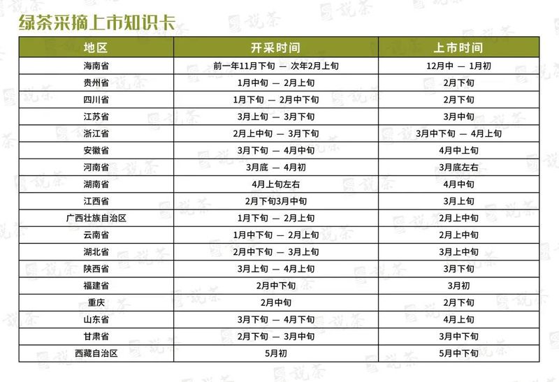 那每年的茶葉到底什么時(shí)候采摘、上市呢?今年,“說(shuō)茶”按品類(lèi)整理了全國茶葉采摘上市時(shí)間表,讓大家了解下茶葉的采制、上市時(shí)間。各茶友可參考各品類(lèi)茶葉的采摘上市時(shí)間,關(guān)注更多個(gè)人喜好的新茶情況。