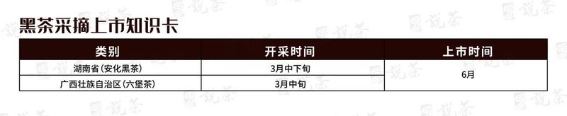 黑茶的采摘上市時(shí)間趨于穩定,基本都于3月中下旬采摘,進(jìn)入6月后陸續上市。