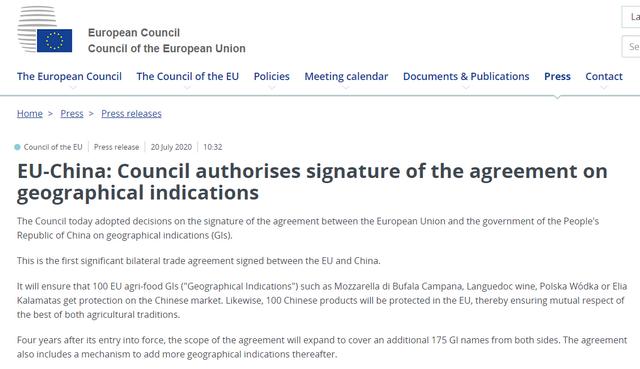 歐盟理事會(huì )當地時(shí)間7月20日作出決定,授權正式簽署中歐地理標志協(xié)定,在中國境內的100個(gè)歐洲地理標志產(chǎn)品和在歐盟境內的100個(gè)中國地理標志產(chǎn)品將受到保護。據協(xié)定條款顯示,28個(gè)茶葉地理標志保護產(chǎn)品入選首批保護...