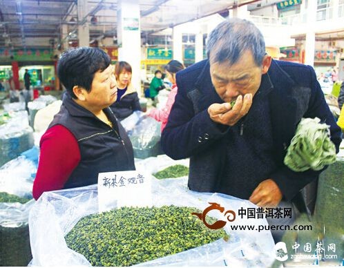 日前,安溪縣金觀(guān)音開(kāi)始密集上市。近年來(lái),因為金觀(guān)音上市早、產(chǎn)量高,香氣馥郁鮮爽,滋味醇厚回甘,深受歡迎。在龍門(mén)、虎邱、龍涓等鄉鎮,金觀(guān)音種植面積增多,打破早市春茶黃金桂“一統天下”局面。圖為茶商在中國茶都采購金觀(guān)音。