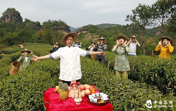 4月13日,武夷山茶農按傳統習俗在茶園舉行“喊山”儀式,眾茶農齊聲高喊“茶發(fā)芽嘍!茶發(fā)芽嘍!”標志一年一度的春茶生產(chǎn)正式開(kāi)始。圖為當日,武夷山天心村茶農吳海(前)等在“喊山”儀式上。