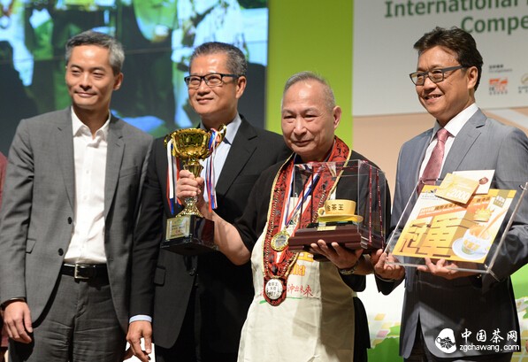 圖:有30年沖茶經(jīng)驗的錢(qián)寶信(右二),擊敗六名對手,成為本港新一任“金茶王”。右三為陳茂波/大公報記者 林良堅攝