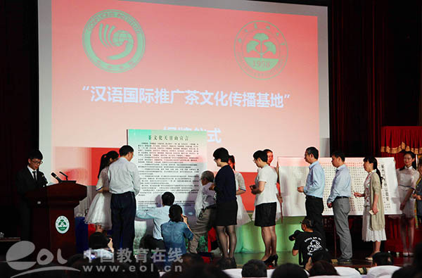浙江省教育廳副廳長鮑學(xué)軍宣讀孔子學(xué)院總部(國家漢辦)同意在浙江農(nóng)林大學(xué)建立漢語國際推廣茶文化傳播基地的文件。中國國際茶文化研究會(huì)、浙江農(nóng)林大學(xué)等10多家機(jī)構(gòu)共同發(fā)表了《茶文化天目山宣言》,將共筑國際茶文化高地、共謀國際茶文化戰(zhàn)略、共享國際茶文化成果、共創(chuàng)國際茶文化品牌,努力打造“全球茶文化傳播總部”,為茶文化傳承與創(chuàng)新提供世界一流的國際化平臺(tái)。