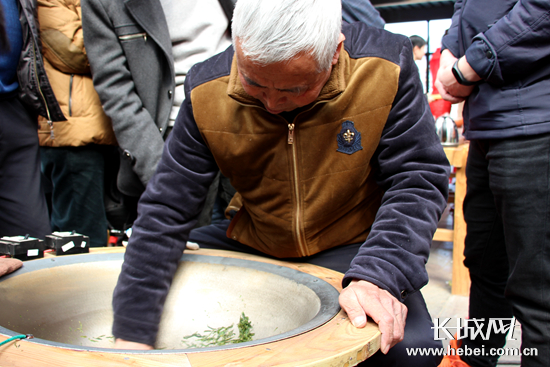 炒茶師傅現場(chǎng)炒制第一鍋春茶。長(cháng)城網(wǎng) 高琳哲 攝