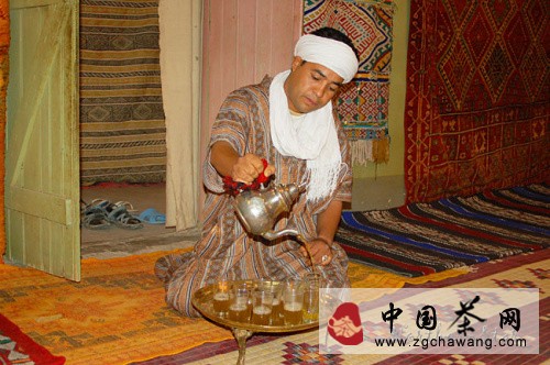 北非人喝茶,喜歡在綠茶里加幾片新鮮的薄荷葉和一些冰糖,此茶清香醇厚,又甜又涼。有客來(lái)訪(fǎng),主人連敬三杯,客人須將茶喝完才算禮貌。