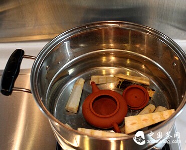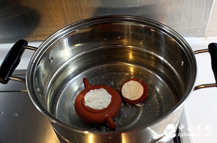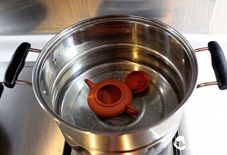 首先徹底清理紫砂壺的污漬(包括遺留的金沙、沙粉等),用沸水內外沖洗一次,然后干凈的壺巾沾清水細細擦凈,然后待壺自然風(fēng)干。然后將茶壺放進(jìn)沒(méi)有油漬的煲,加3倍高度的水(清水的量以淹過(guò)壺1寸許即可)煮兩小時(shí),這樣茶壺的泥土味及火氣都會(huì )去掉。