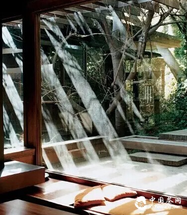 這間茶室的作者和位置榜叔都不甚清楚,只是被這樣暖心又悠然的設計打動(dòng)了。設計師應該是個(gè)崇尚自然生活的人。幾乎整面墻都做成落地玻璃窗,通過(guò)天頂木欄的獨特設計,讓陽(yáng)光像水一樣從天頂傾斜下來(lái),直接鋪灑到房間地板和屋外的陽(yáng)臺上。