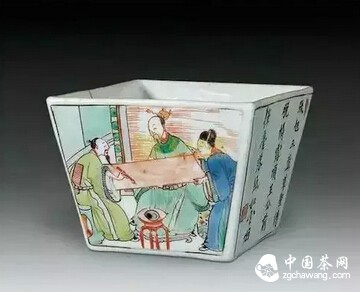 9、方斗杯:流行于明代嘉靖時(shí)期的一種杯式,因形似方斗而得名。古時(shí)制作方形器,不似圓器那樣能利用陶車(chē)的旋轉,直接拉坯而成,其工藝比較特殊,需要將坯泥制成片狀粘接而成。由于工藝復雜,技術(shù)局限,嘉靖時(shí)期方斗杯多不規整。清康熙時(shí)期,出現一種提梁式方斗杯。杯內有一橫梁,將兩側內壁連接起來(lái),由此加強了方斗杯在燒制過(guò)程中的強度,使器形十分規整。