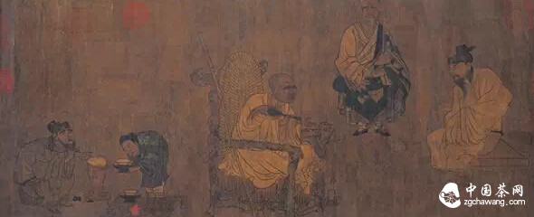 這幅畫(huà)生動(dòng)地描繪了唐代民間斗茶的情景。畫(huà)面上有6個(gè)平民,似乎三人為一組,各自身旁放著(zhù)自己帶來(lái)的茶具、茶爐及茶葉,左邊三人中一人正在爐上煎茶,一卷袖人正持盞提壺將茶湯注入盞中,另一人手提茶壺似在夸耀自己茶葉的優(yōu)異。右邊三人中兩人正在仔細品飲,一赤腳者腰間帶有專(zhuān)門(mén)為盛裝名茶的小茶盒,并且手持茶罐作研茶狀,同時(shí)三人似乎都在注意聽(tīng)取對方的介紹,也準備發(fā)表斗茶高論。整個(gè)畫(huà)面人物刻畫(huà)逼真,再現了唐代某些產(chǎn)區已出現的斗茶情景。