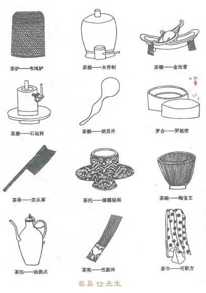 《茶具圖贊》是我國第一部以圖譜形式寫(xiě)茶具的專(zhuān)著(zhù)。審安老人用白描畫(huà)法繪制出了宋代著(zhù)名斗茶所用的茶具12件,稱(chēng)為“十二先生”。